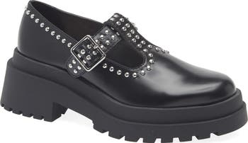 High-polish studs and a chunky lugged platform bring bold biker edge to this buckled mary jane made from smooth leather.