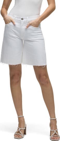 Stroll through sunny days in these relaxed-fitting Bermuda shorts cut from low-stretch denim and finished with raw hems.
