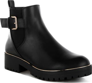 A round toe and chunky heel balance a lug-sole bootie fashioned with a comfort-cushioned footbed and a back zipper for easy entry.