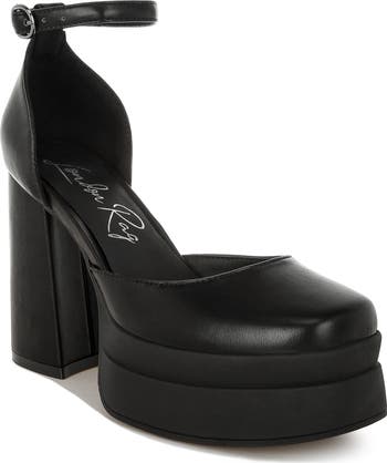Elevate your look with this smooth faux-leather pump boosted by a dramatic platform and lofty block heel.