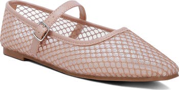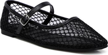A sheer mesh upper and adjustable mary jane strap bring comfortable elements to a versatile flat grounded by a durable rubber sole.