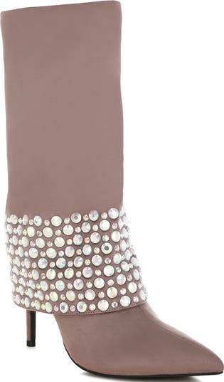 A pointy toe and stiletto heel balance a foldover rhinestone-adorned boot fashioned with a comfort-cushioned footbed for nightlong comfort.
