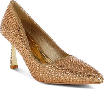 Brilliant rhinestones combined with a contrast rhinestone covered heel make this pointed-toe pump a chic choice for adding flair to your special-occasion style.