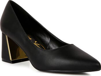 Polished hardware defines the underside of the block heel that lofts a sophisticated pump elongated by a sleek pointy toe.