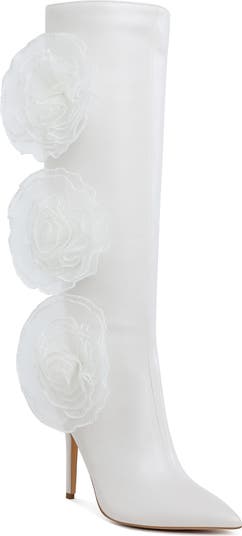 Graceful mesh roses bloom proudly on the side of this faux-leather boot balanced upon a stiletto heel.