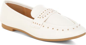 A squared-off apron toe with gleaming studded trim defines this loafer-inspired flat grounded on a flexible sole.
