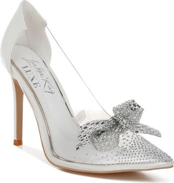 Glam up your look with this sparkly bow-embellished stilleto pump framed by clear and metallic panels for added shine.