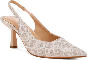 Squares of rectangles pattern a pointy-toe pump lofted by a kitten heel.