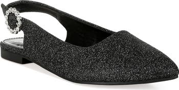 A rhinestones-embellished buckle sparkles at the ankle of a pointy toe slingback flat covered in a glitter-covered faux leather.