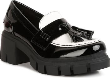 A chunky platform and blocky heel loft this loafer-inspired pump topped with a darling tassel.