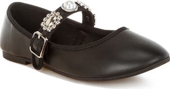 Ornate embellishments charm the top strap of this timeless mary-jane flat grounded on a flexible sole.