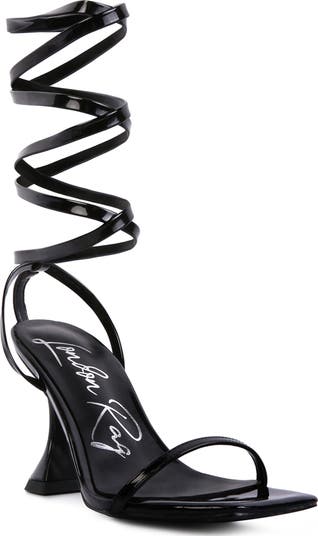 Patent faux-leather straps wrap around your calves in this sandal lofted by a flared heel.