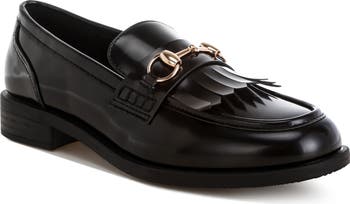 Polished bit hardware illuminates the kiltie vamp of a sophisticated loafer crafted from soft faux leather and set on a low block heel.
