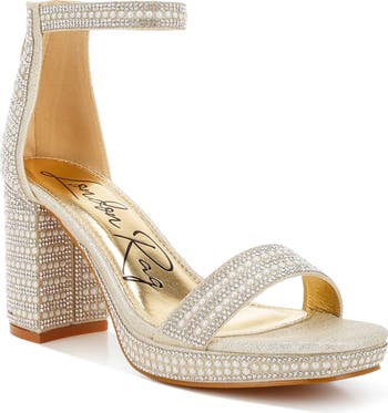 Shimmering fabric peeks through rows of glossy faux pearls and sparkling crystals, creating a party-perfect sandal. A supportive platform and secure ankle strap keep you balanced in this dazzling, show-stopping style.