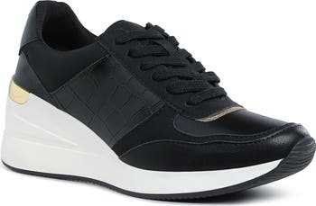 A wedge heel defines a sporty sneaker fashioned with a comfort-cushioned footbed and croc-embossed panels for added texture.
