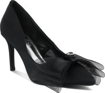 A romantic tulle bow centered by a sparkling crystal adorns this pointed-toe satin pump lifted by a chic stiletto heel.