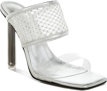 Clear and rhinestone-dotted mesh straps bring chic night-out style to a square-toe sandal lofted by a striking stiletto heel.