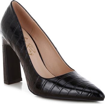 A croc-embossed finish heightens the chic style of this classic pump framed by a pointed toe and lofty block heel.