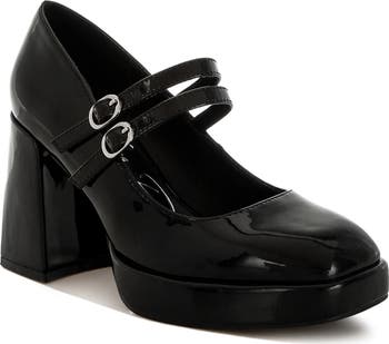 Buckled hardware gives subtle shine to the double mary-jane straps atop this classic pump that's lofted by a blocky heel.