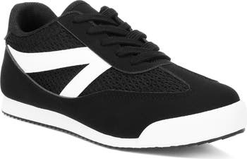 Show off sporty style in this breathable mesh and faux-leather sneaker featuring a comfortably cushioned footbed and herringbone-grip sole.
