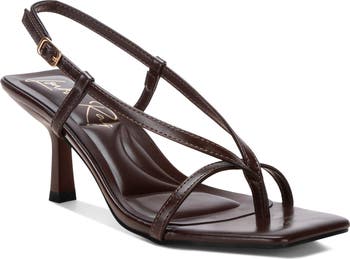 Show off chic style in this strappy slingback sandal fashioned with a squared open toe and slender heel.