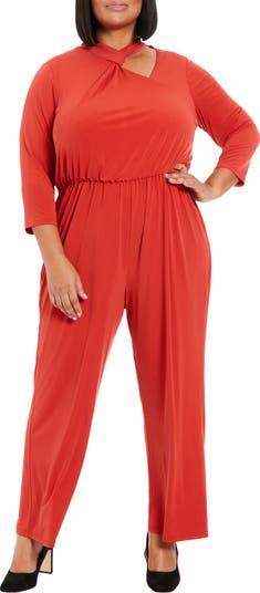 Set the trend in this stretch-jersey jumpsuit fashioned with an asymmetric neck cutout and a draped blouson waist.