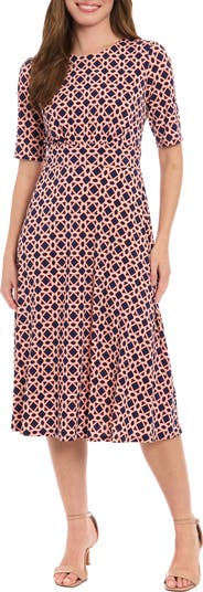 A banded waist creates a fit-and-flare silhouette on a patterned midi dress made from stretchy jersey that's soft and easy to wear no matter the occasion.