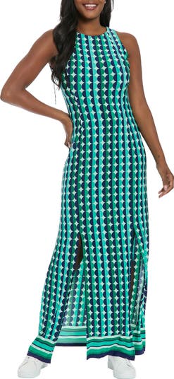 A geometric print brings retro charm to this sleeveless maxi dress eased by airy front slits.
