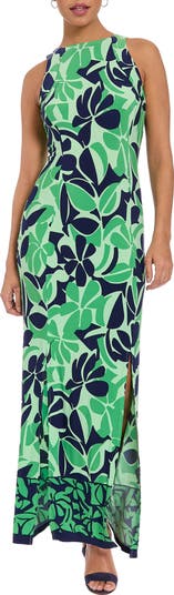 Retro-inspired foliage makes a groovy statement on this figure-hugging sheath cut with cutaway shoulders and a front slit.