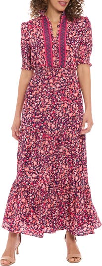 Playful ruffles outline the V-neckline of this A-line maxi dress styled with a smocked waist and cuffs.