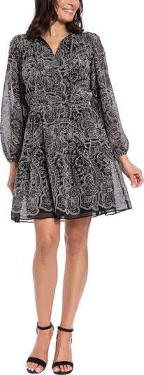 Dainty blooms and swirls of paisley are embroidered allover a stem-baring dress framed by blousy sleeves.