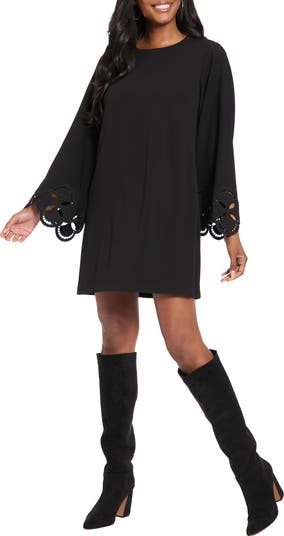 Embroidered bell sleeves bring retro charm to this unstructured trapeze dress cut from soft stretch crepe.