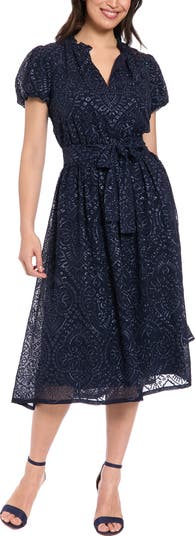 Allover eyelet embroidery lends depth and dimension to a fit-and-flare midi dress framed by puffy sleeves and snatched at the waist by a matching tie.