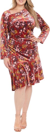 A charming floral print enriches a ruched velour midi dress fashioned with asymmetric neck and diagonal flounced hem for contemporary appeal.