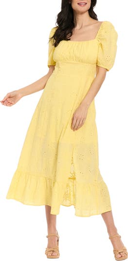 Floral Embroidered Eyelet Puff Sleeve Cotton Midi Dress