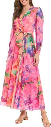 A charming floral print brightens an airy mesh maxi dress fashioned with gently puffed sleeves and an elegantly draped faux-wrap silhouette.