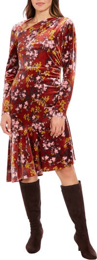 Scattered blooms adorn an elegantly ruched velour midi dress framed by a charming asymmetric neck and flounced hem.