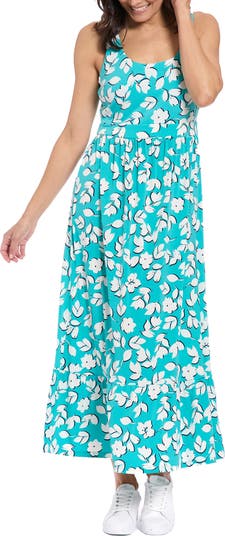 A garden of flowers blooms upon a sleeveless dress that's cut to a maxi length.