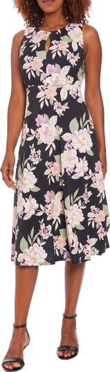 Sharp pleats add texture and movement to this sleeveless dress showered with delightful blooms and punctuated with a swingy twirl-worthy skirt.