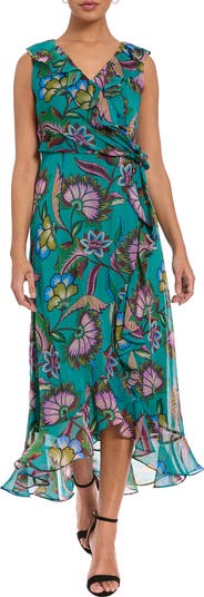 Fluttery ruffles frame this floral chiffon faux-wrap dress framed by attached side ties and graceful high-low hem.