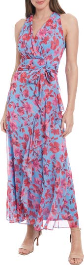 A charming floral print brightens this sleeveless chiffon maxi dress fashioned with a faux-wrap bodice, cascading ruffles and a removable tie belt.
