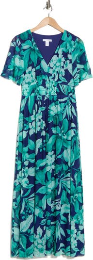Bold flowers amplify the romantic appeal of a lightweight mesh maxi dress fashioned with a smocked bodice panel and fluttery sleeves.