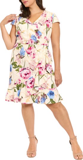 A pretty garden of blooms emboldens the look of a classic midi dress that's edged in frilly ruffled trim to add fun and flirt.