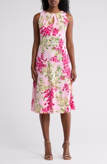 A charming floral printed midi dress features a front keyhole and A-line silhouette for flattering feminine style.