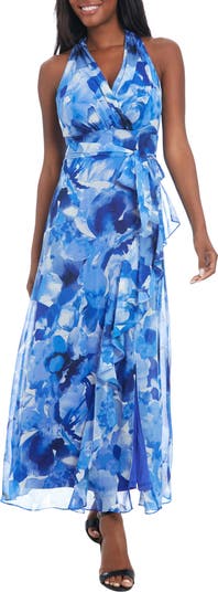 A garden of flowers blooms upon a breezy maxi-length dress fashioned with a tied belt and sleeveless silhouette.
