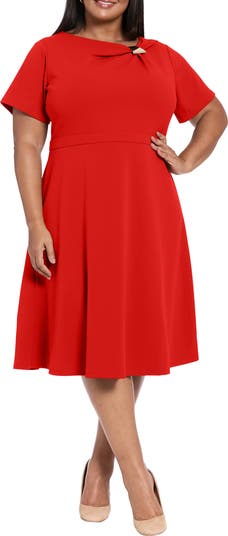 A polished hardware accent shines at the asymmetric neckline of this flowy fit-and-flare dress cut from stretchy scuba fabric.