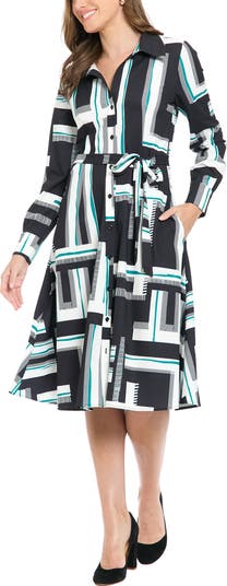 Make a statement in this shirtdress polished with a spread collar, button-cuff long sleeves and an A-line skirt for a silhouette that moves effortlessly with every step.