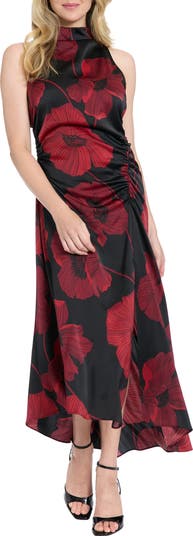 Gentle ruching at the left side shapes this floral-covered dress framed with a mock neckline and cutaway shoulders.