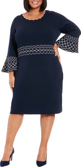 A piped trim distinguishes the bell cuffs and waist of a sweater dress that's knit from soft yarn for lasting comfort.