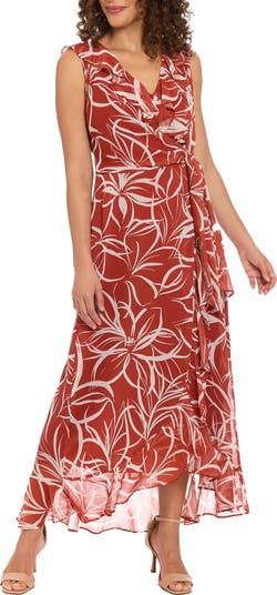 Dainty ruffles frame an abstract floral printed maxi dress cut from lightweight chiffon in a flowy faux-wrap silhouette.